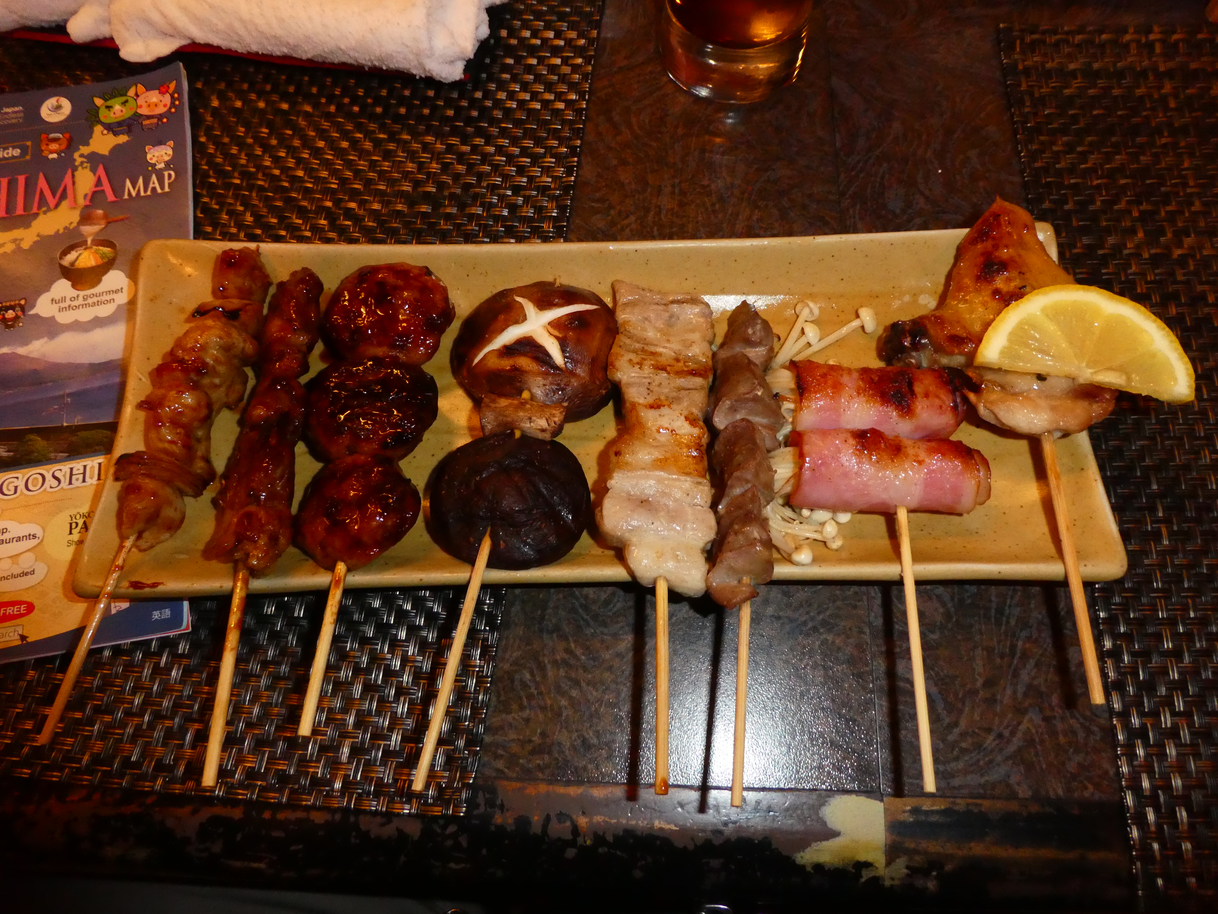 Pommes (aus Kartoffeln aber auch Lotuswurzeln) – ganz hervorragend.Und Yakitori. Einer mit frittierter Hühnchenhaut, die anderen (die aussehen wir große Löffel) sind Tsukune, also aus gewürztem Hühnchenhack gegrillt mit Eigelb zum Tunken.