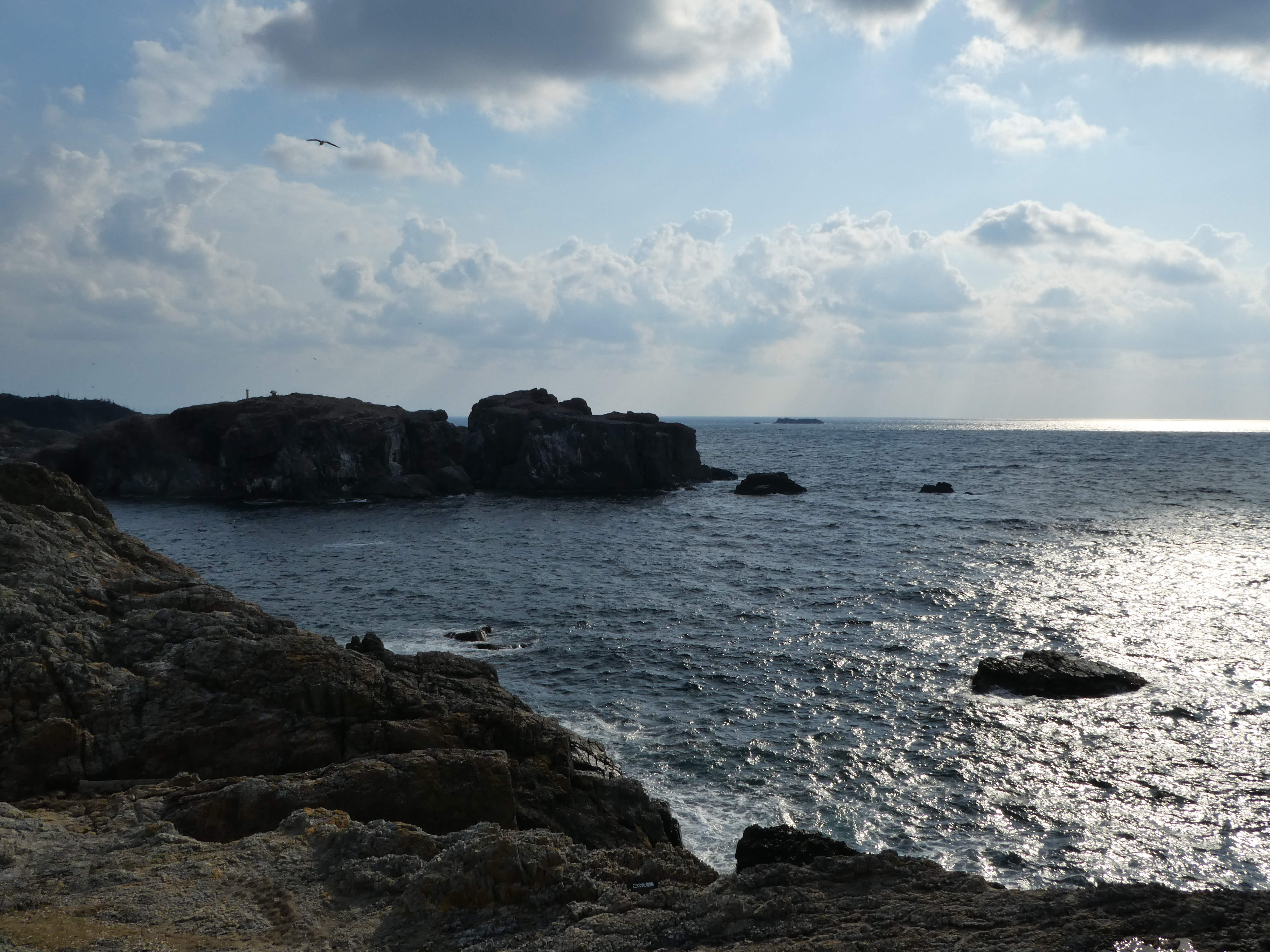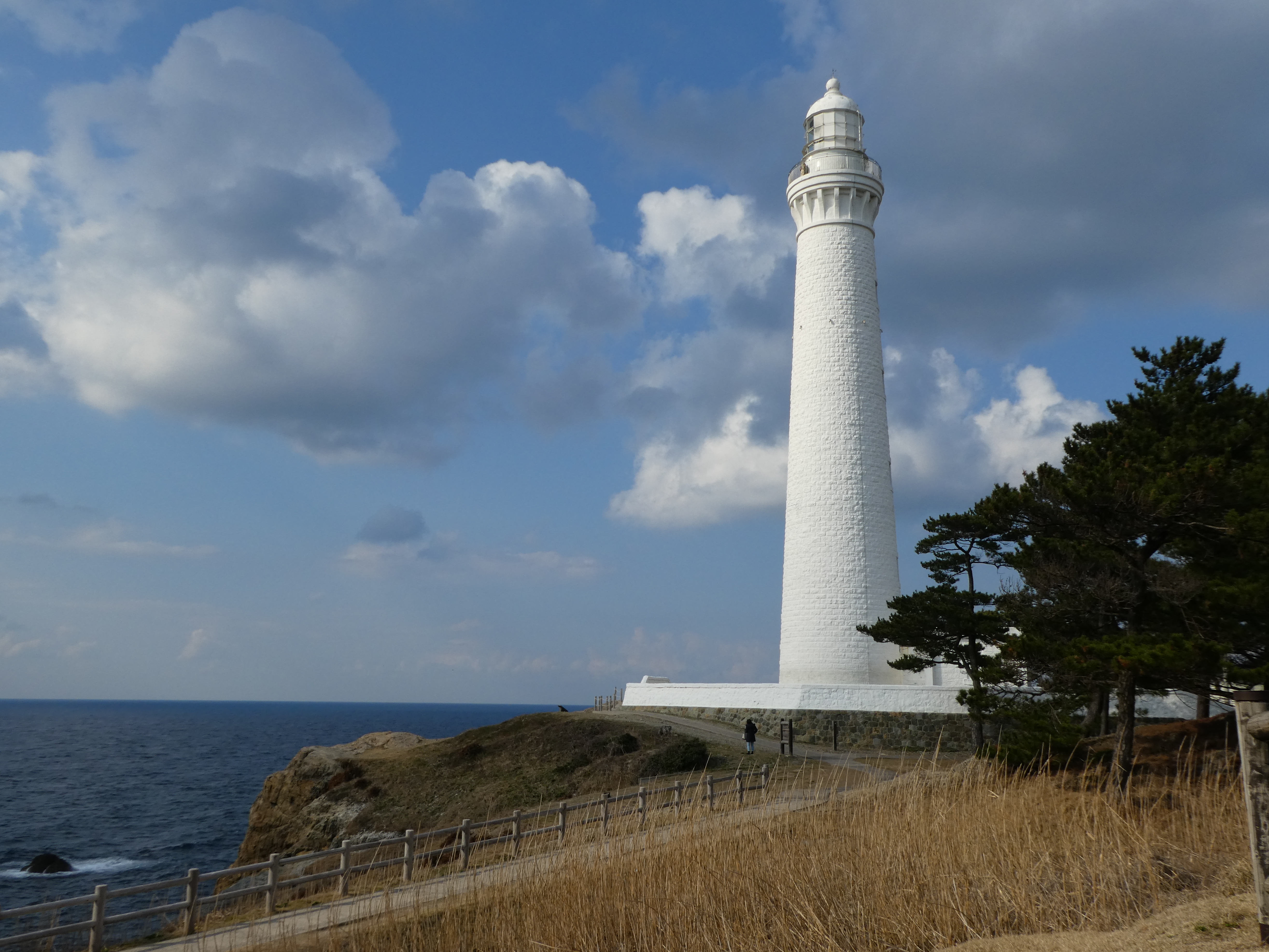 . Direkt neben dem Schrein liegt die größte Hochzeitshalle in ganz Japan – und das in einer recht entlegenen Gegend.Nördlich von Izumo liegt das Kap Hinomisake an der Küste zum japanischen Meer. Da sind wir auch noch hin, was sich landschaftlich bewährt hat, denn es ist eine schöne Steilküste und es gibt einen Leuchtturm und Unmengen Vögel – Möwen und Raubvögel, zu denen gleich noch mehr.Der Leuchtturm, wohl der höchste in Japan:Auf dieser Felsinsel ist auch ein kleiner Schrein, das sieht man am Tori (der „Torbogen“).Da wimmelt es nur so von Möwen.