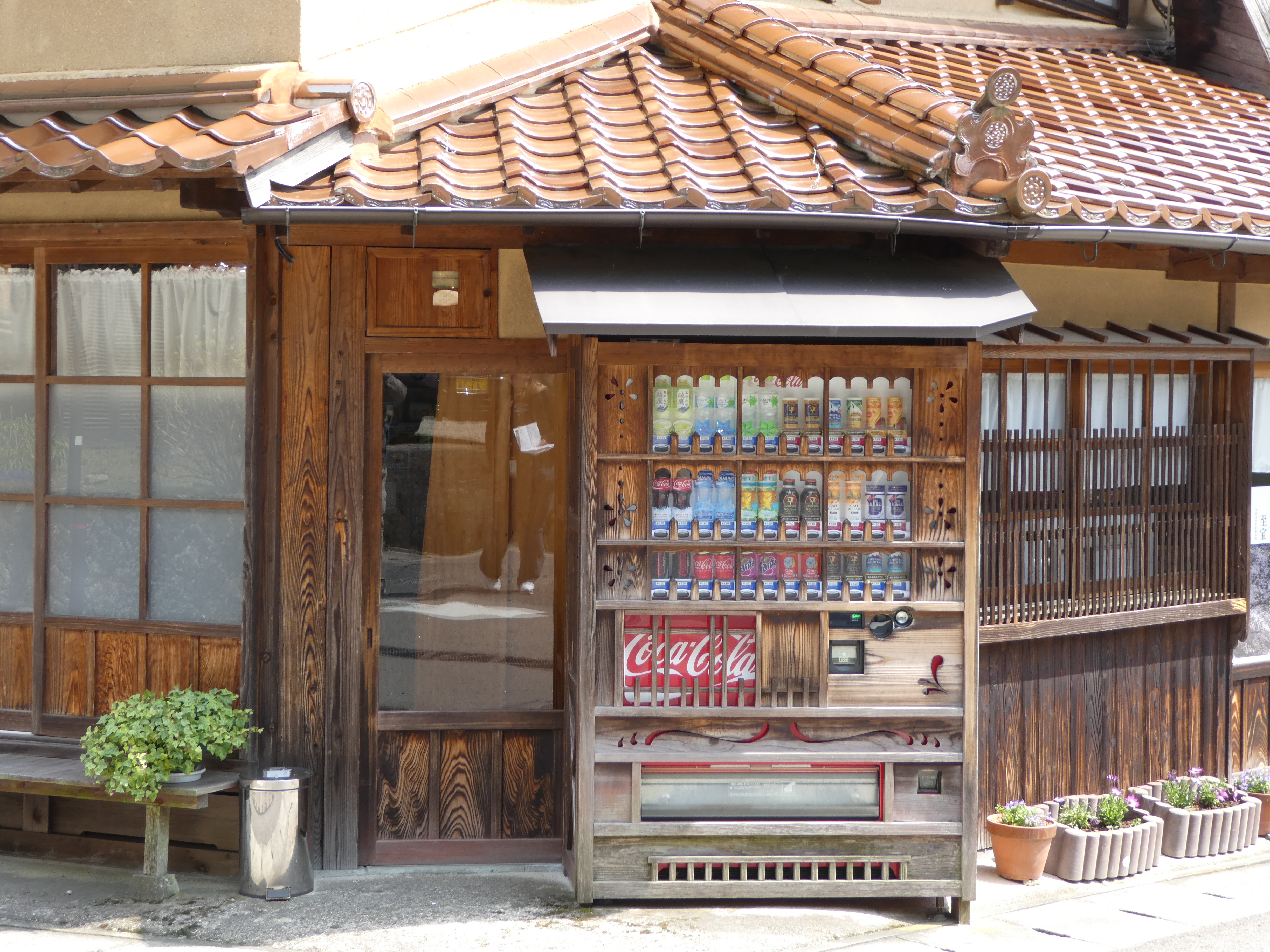 So kann man sich den Weg zum Stollen vorstellen.Auf dem Weg gibt es viele Tempel.Warum? Minenarbeit ist gefährlich und fürs Bestatten sind die buddhistischen Tempel zuständig.Hier ein geschlossener und überfluteter Minenschacht.Ziel der Wanderung ist ein erhaltener Minenschacht, durch den man ca. 300 Meter durchgehen kann.Allerdings bereits für den modernen Japaner in erweiterten Dimension. Für mich war’s immer noch eng und vor allem niedrig.Das Dorf selber kann man sich so vorstellen.Dies ist eine alte Grundschule, wie sie früher überall in Japan aussahen, aber heute natürlich eine Rarität sind. Das Gebäude wird noch von ca. 12 Schülern genutzt – Omori ist nicht gerade dicht besiedelt.Selbst die unverzichtbaren und allgegenwärtigen Getränkeautomaten wurden an das Stadtbild angepasst.Dabei machten wir eine bizarre Entdeckung.In der Tat hat der Bäcker eine Lehre in einer Bäckerei in Baden-Württemberg gemacht. Drum gibt es da auch schwäbische Brezeln, die entsprechend original schmecken.Hier das ehemalige Haus des Gouverneurs der Region.Sowie ein alter Schrein……der für die Drachenmalerei an der Decke der Gebetshalle bekannt ist.Interessanterweise haben sich die Katzen der Region…auf Tarnung durch Fellfarbe spezialisiert.