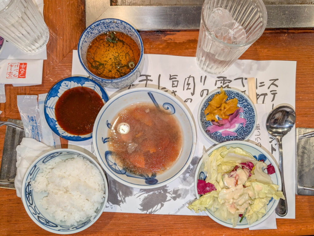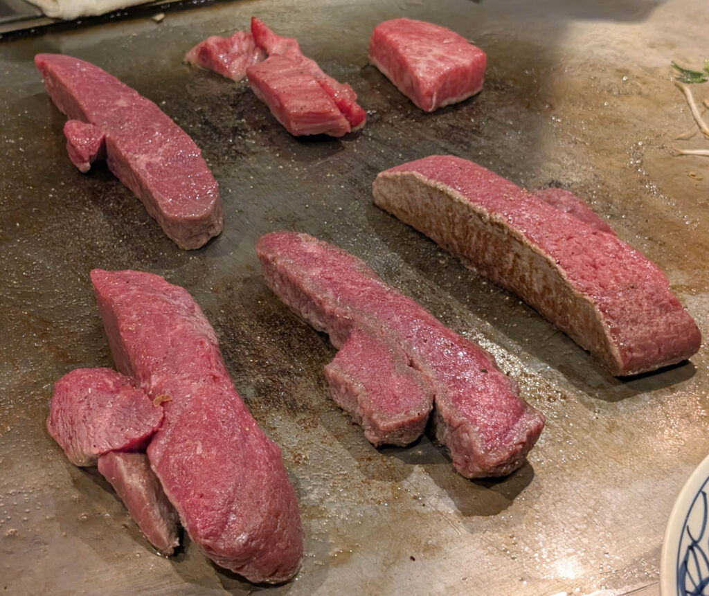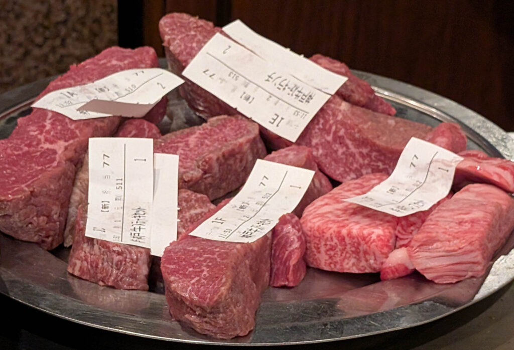Aber eigentlich war ich in Kobe, um dort das berühmte Kobe Beef zu essen. Das ist strikt reguliert und ziemlich teuer, aber eben von höchster Qualität. In Kobe gibt es eine Anzahl von Restaurants, die Kobe Beef servieren, aber für fast alle braucht man eine (nicht einfach zu bekommende) Reservierung. Also bin ich ins Steakland gegangen – eins der touristischsten Kobe Beef Restaurants, aber man braucht keine Reservierung und das Fleisch ist echt.