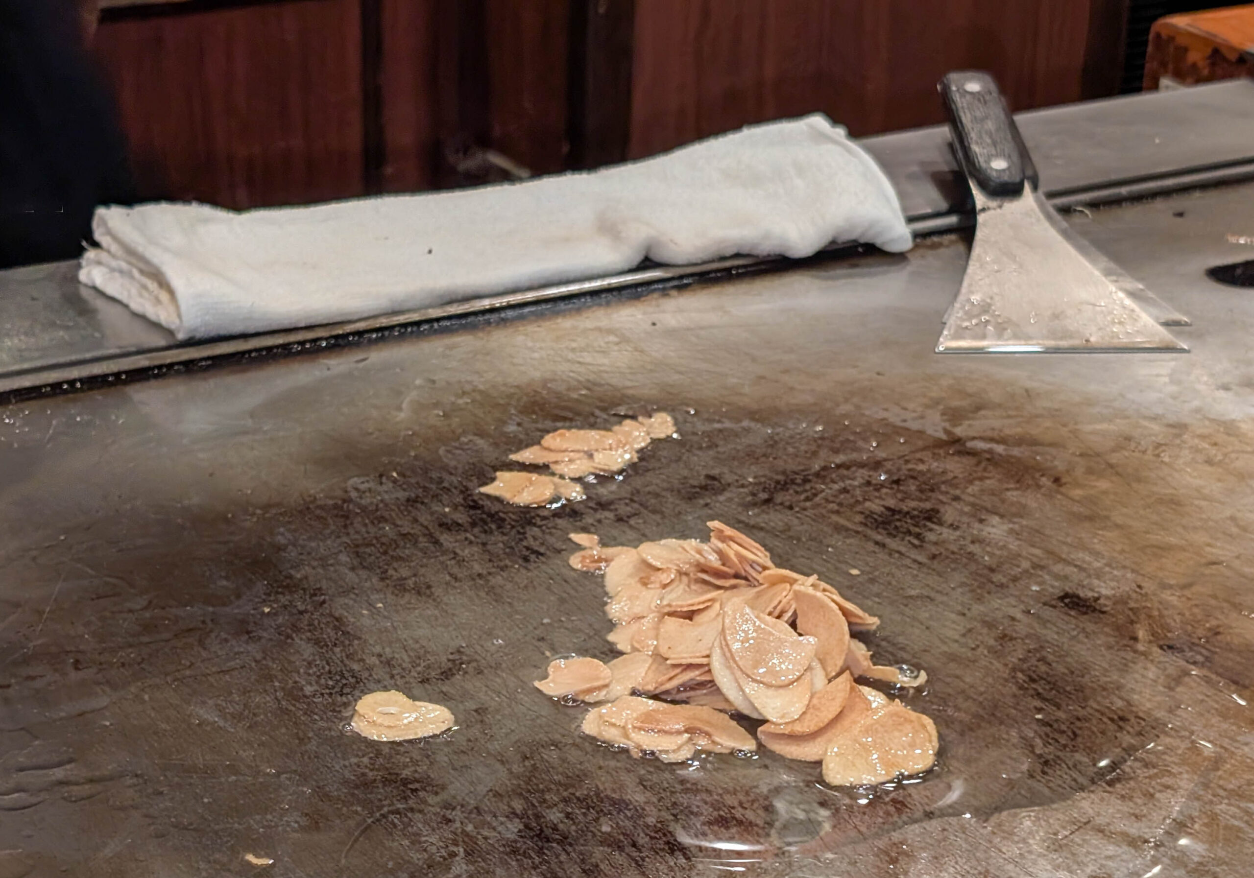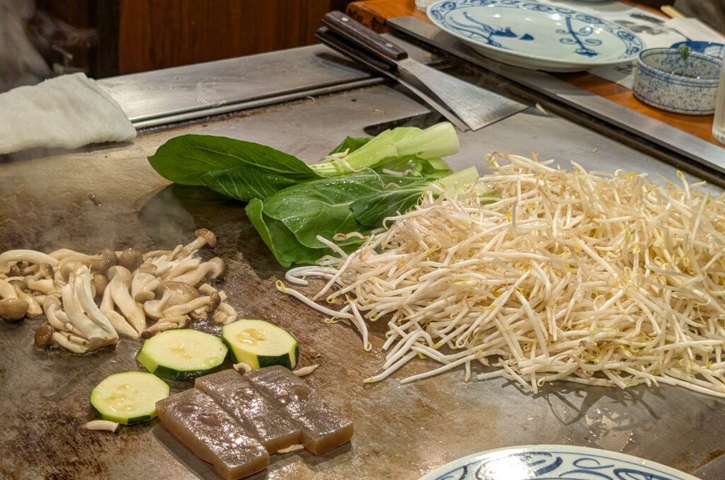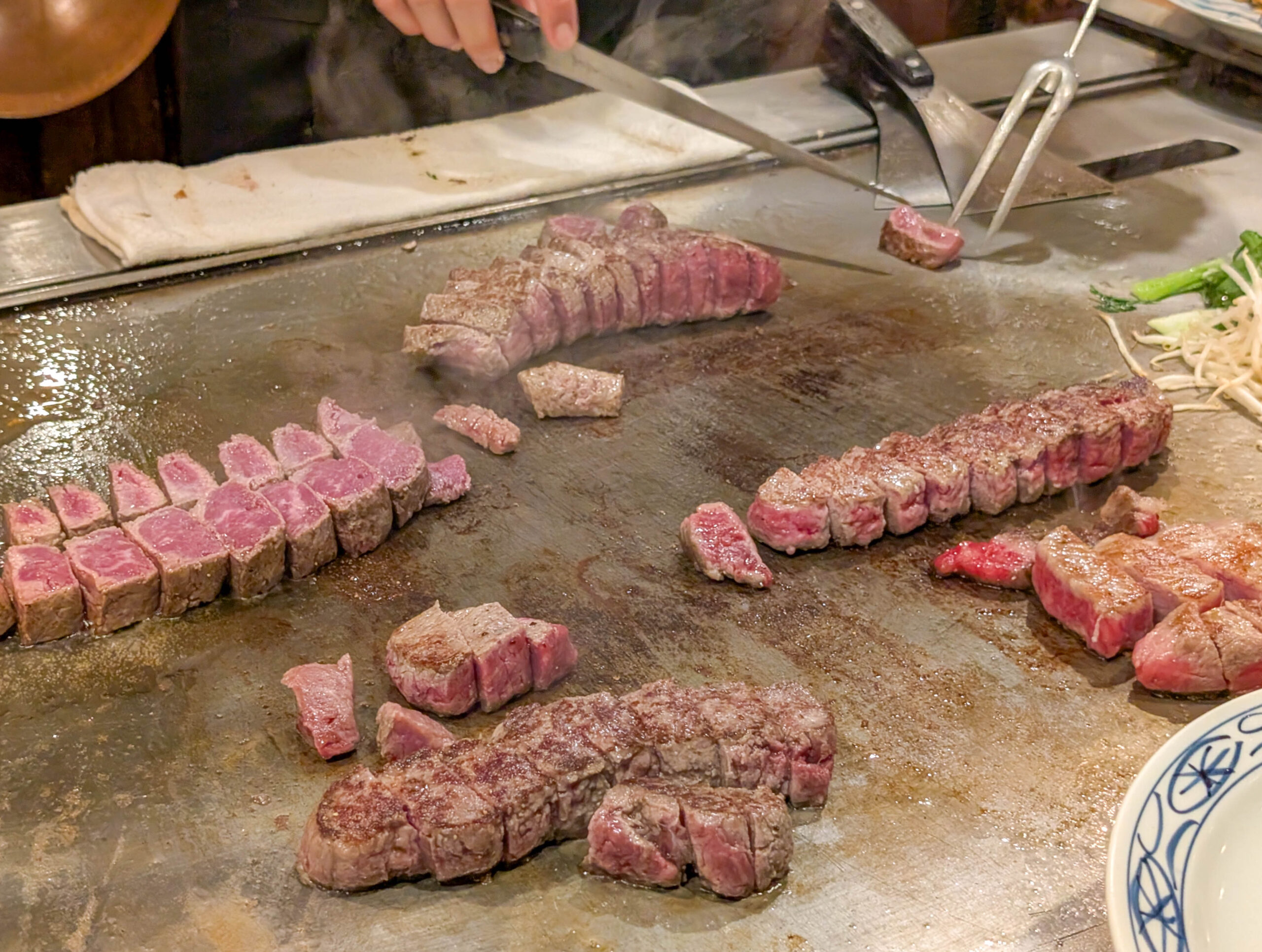 Leider war ich nicht der einzige mit dieser Idee. Obwohl ich nur ca. 15 Minuten nach Öffnung um 11.00 Uhr da war war schon eine ziemlich lange Schlange. Man musste eine Nummer ziehen und dann warten, in einer Art extrem chaotischen Vorhölle. Fühlte sich aber länger an, als es war, ca. 30 Minuten. Es werden dann immer Gruppen von sieben Gästen zusammengestellt und an einen Teppanyaki-Tisch geführt. Man kann aus verschiedenen Menüs mit unterschiedlichen Fleischgrößen und -qualitäten auswählen, dann geht es los.