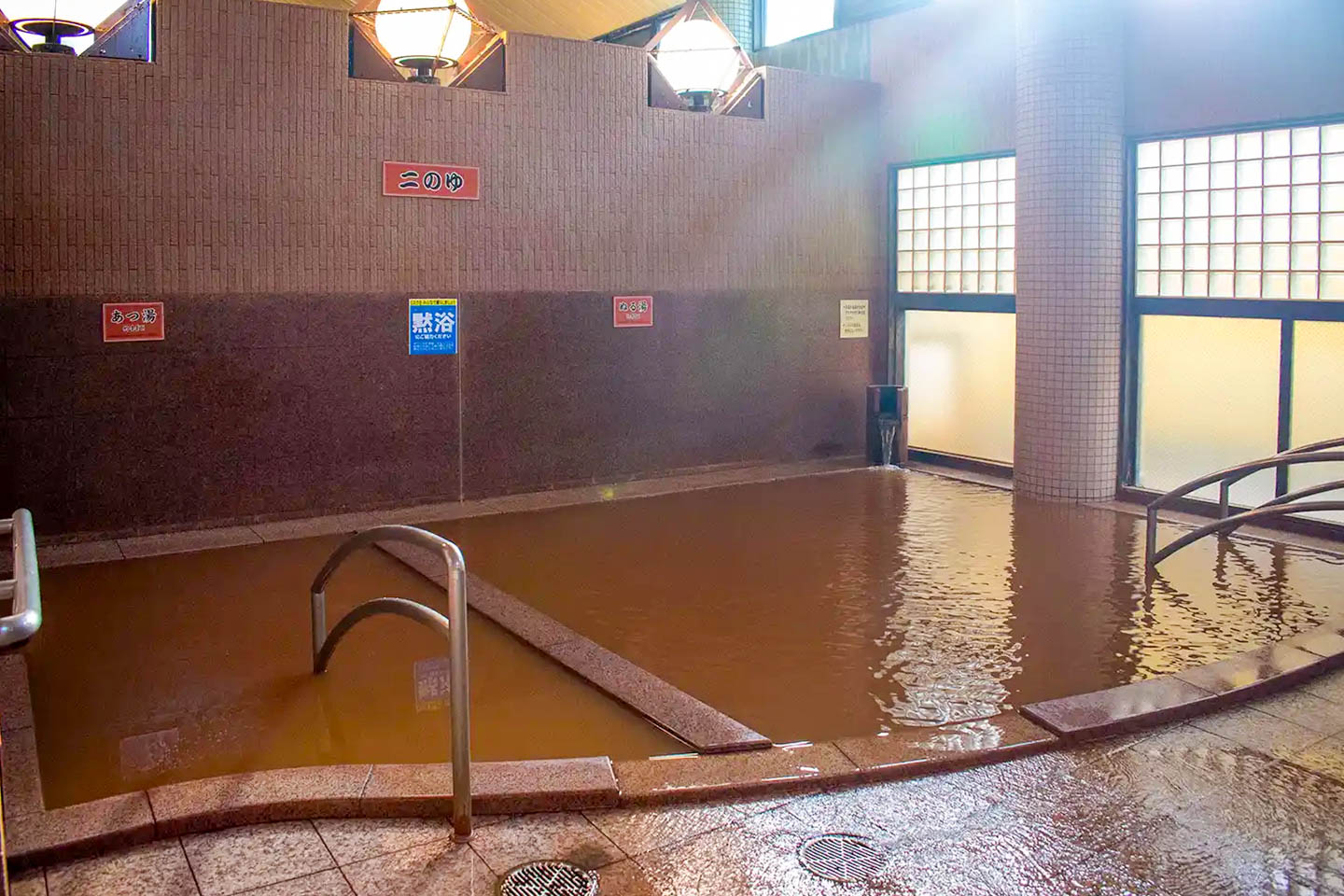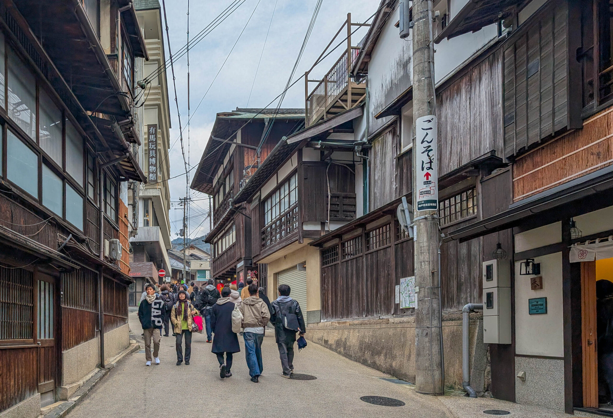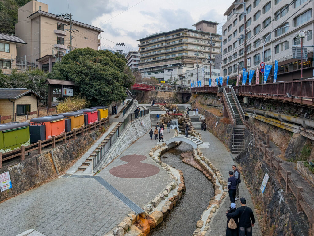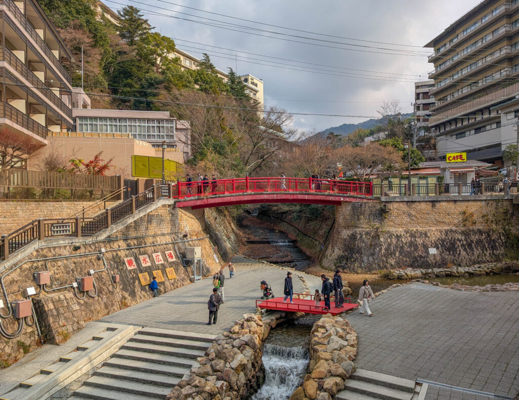 Nun gehört zum Stadtgebiet von Kobe auch ein Onsen-Städtchen namens Arima, erreichbar mit dem Vorstadtzug in ca. 30 Minuten. Wer mich kennt, weiß, dass ich da hin musste. Leider ging es da ähnlich rund wie im Steakhaus. In das eigentlich angestrebte Bad (ein Luxus-Spa mit Restaurants u.a.) bin ich gar nicht reingekommen bzw. ich hatte keine Lust, mehr als eine Stunde auf Einlass zu warten. Dafür bin ich dann ins Kin no Yu, das „goldene“ Bad, wo man in dem Wasser von einer der beiden heißen Quellen von Arima baden kann. (Die andere Quelle wäre im Gin no Yu, dem „silbernen“ Bad). Auch hier musst ich anstehen, aber nur ca. 10 Minuten, das ist OK.