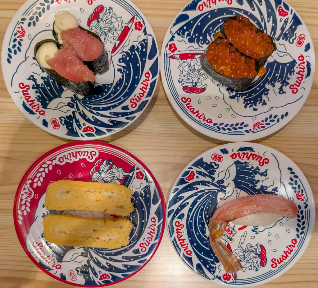Gegessen habe ich nicht bei einem der Restaurants mit den lustigen Fassaden, sondern bei Sushiro. Das ist der direkte Konkurrent von Kura Sushi, wo man Sushi und mehr mit dem Tablet bestellt und es per Fließband direkt an den Tisch kommt. Wartezeit war um 18.15 Uhr bei Null, sehr fein.