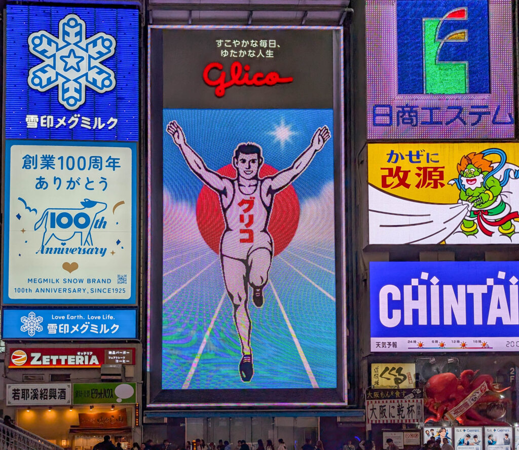 Wer sich nun fragt, für was der eigentlich Werbung macht: Ezaki Glico ist ein japanischer Lebensmittelhersteller (vor allem Süßwaren). Heute kennt man sie vor allem für die weit verbreiteten „Pocky“ und „Pretz“ Produkte. (Pocki sind Keksstangen mit teilweisem Schoko- oder anderem Überzug. In Deutschland wird das als „Mikado“ vermarktet.)