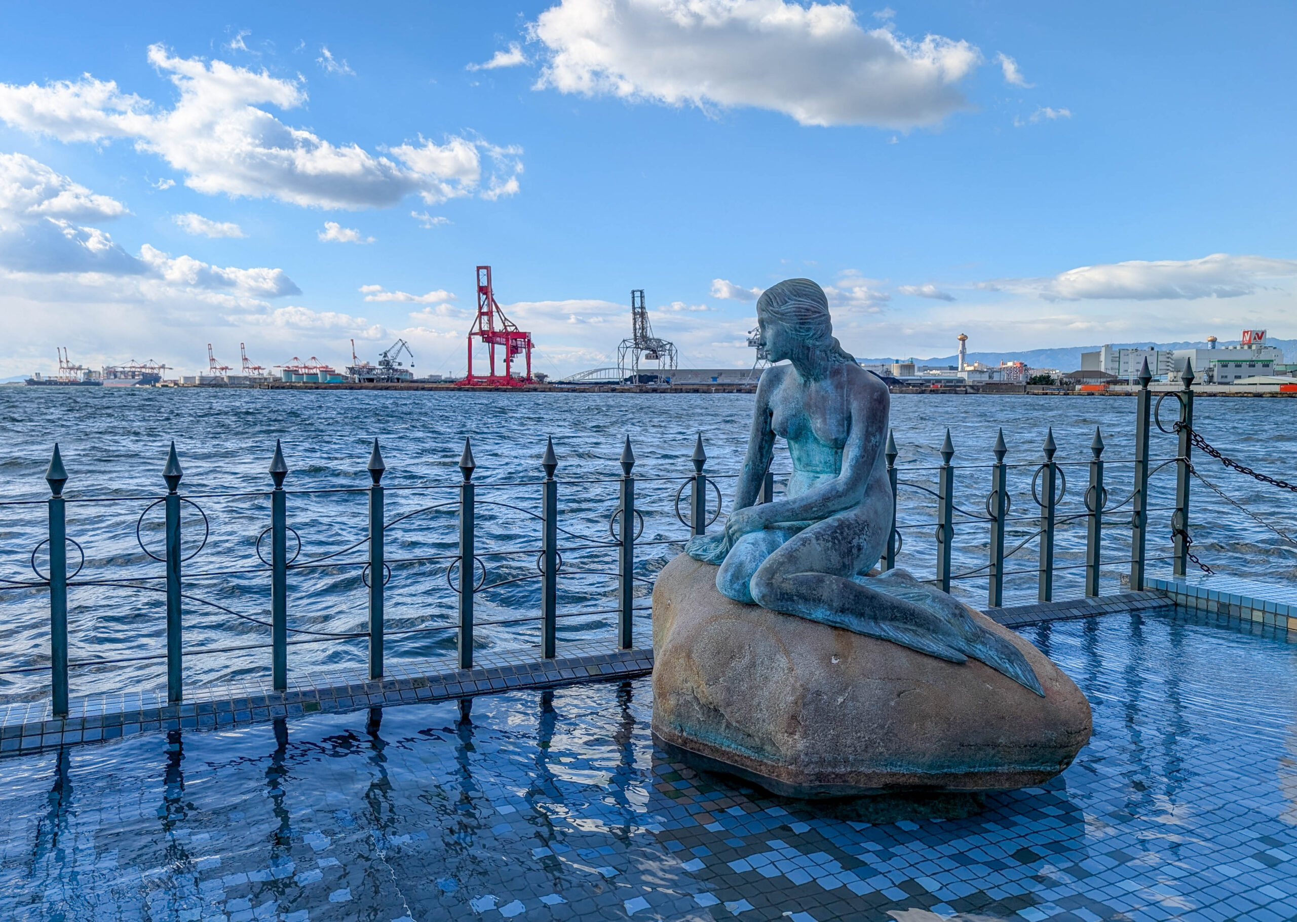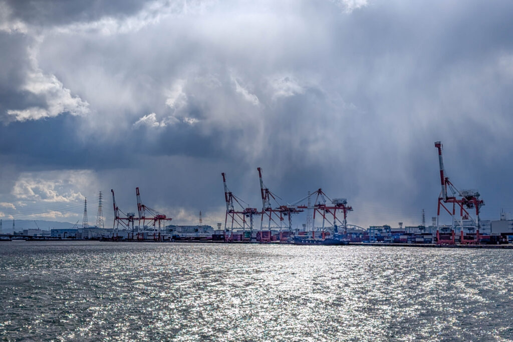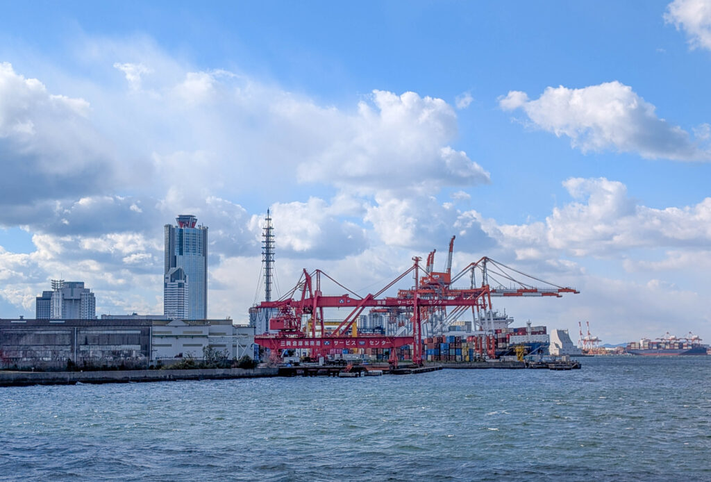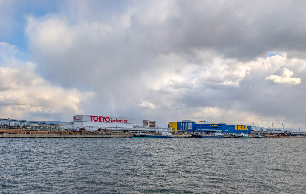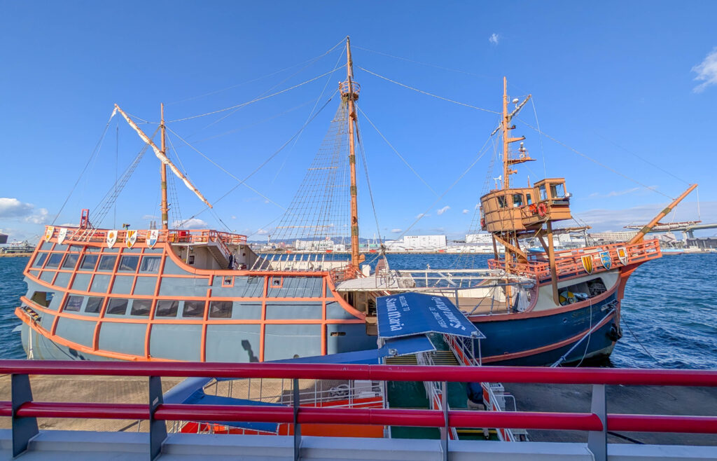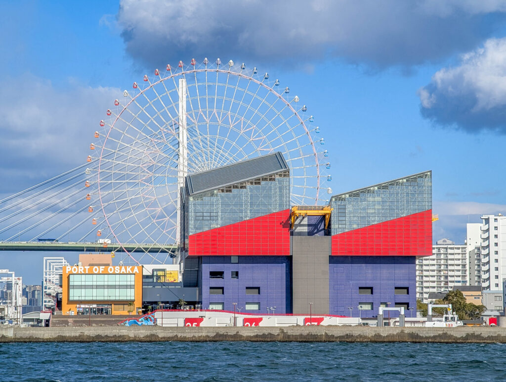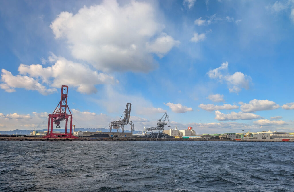 Direkt neben dem Kaiyukan gibt es eine Schiffsrundfahrt auf einer Fake-Karavelle, der Santa Maria. Die bringt einen leider nicht, wie einst das Schiff von Kolumbus, in die Karibik. Das wäre heute echt angenehm gewesen, denn es war kalt, am Wasser ging ein eisiger Wind und es schneite sogar ein wenig. Tatsächlich fehlte mir noch eine Hafenrundfahrt in der Sammlung, also habe ich die 45-minütige Tour gemacht. Dabei sieht man gut, dass Osaka halt nicht nur ein touristisches Ziel und die „Küche Japans“ ist, sondern eben auch eine Industriestadt und ein wichtiger Hafen (wobei Kobe glaube ich als Hafen noch bedeutsamer ist).