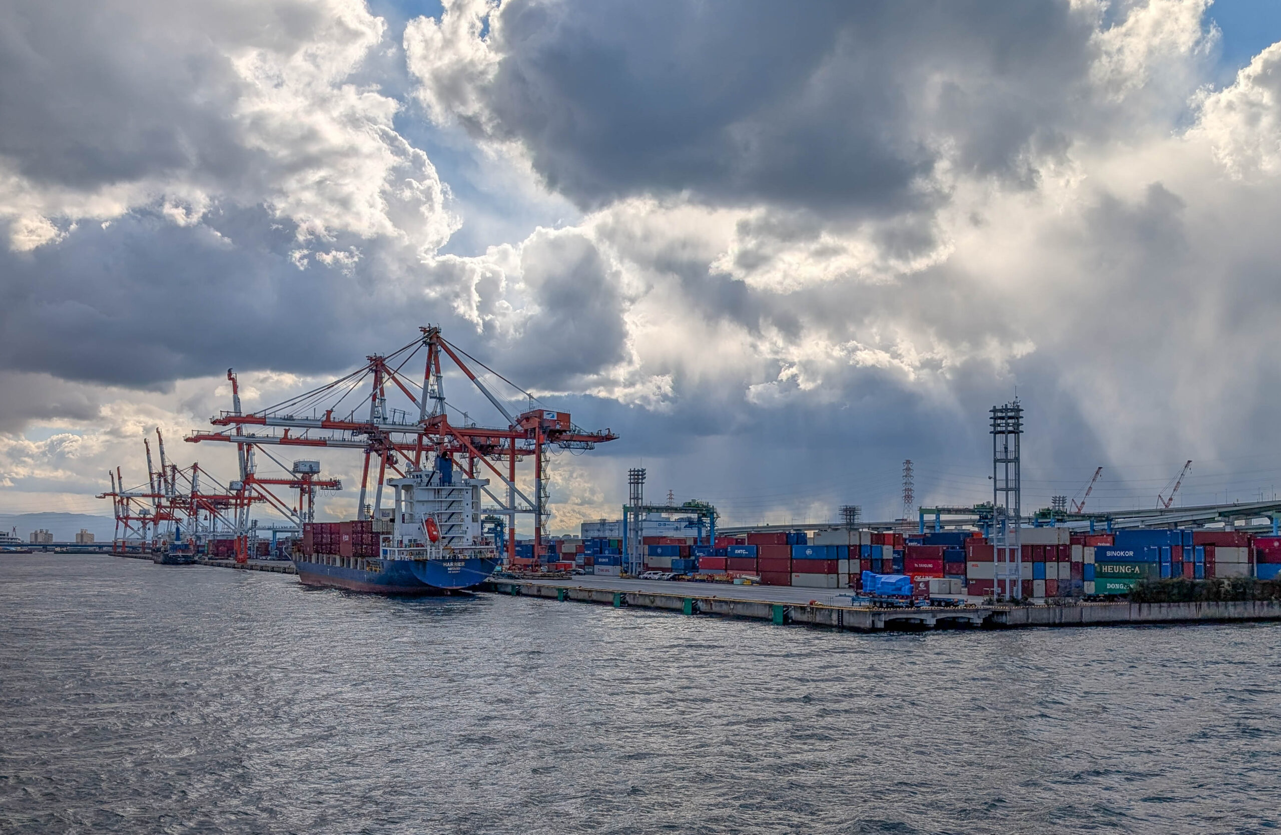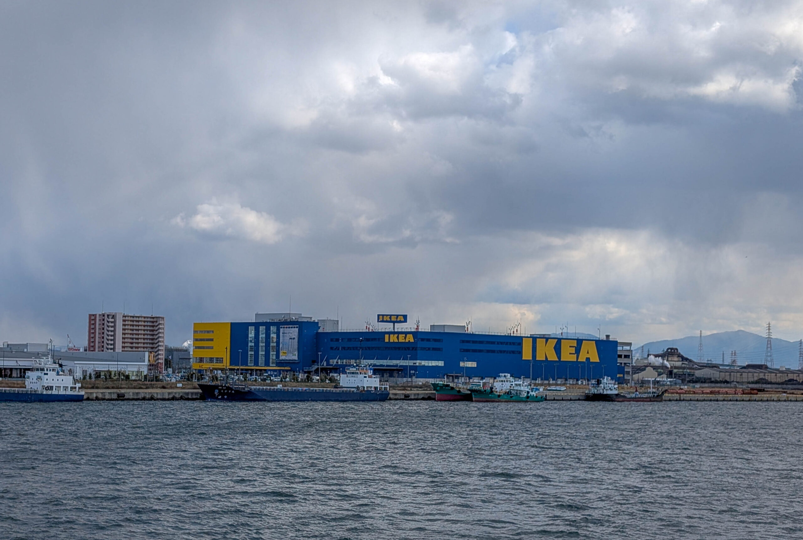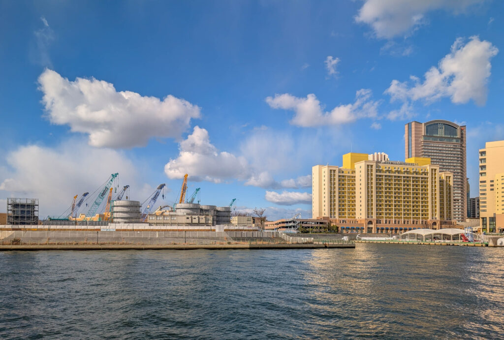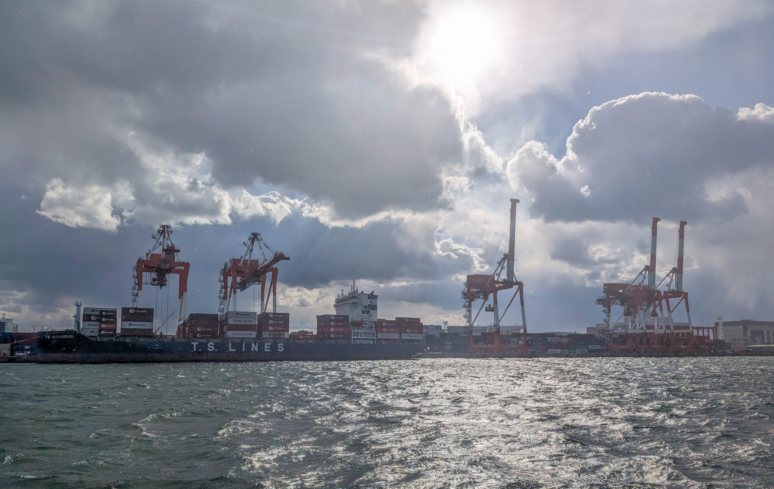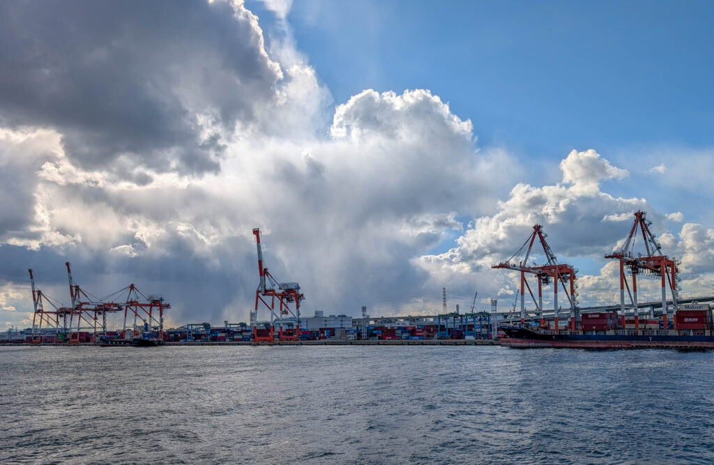 Direkt neben dem Kaiyukan gibt es eine Schiffsrundfahrt auf einer Fake-Karavelle, der Santa Maria. Die bringt einen leider nicht, wie einst das Schiff von Kolumbus, in die Karibik. Das wäre heute echt angenehm gewesen, denn es war kalt, am Wasser ging ein eisiger Wind und es schneite sogar ein wenig. Tatsächlich fehlte mir noch eine Hafenrundfahrt in der Sammlung, also habe ich die 45-minütige Tour gemacht. Dabei sieht man gut, dass Osaka halt nicht nur ein touristisches Ziel und die „Küche Japans“ ist, sondern eben auch eine Industriestadt und ein wichtiger Hafen (wobei Kobe glaube ich als Hafen noch bedeutsamer ist).