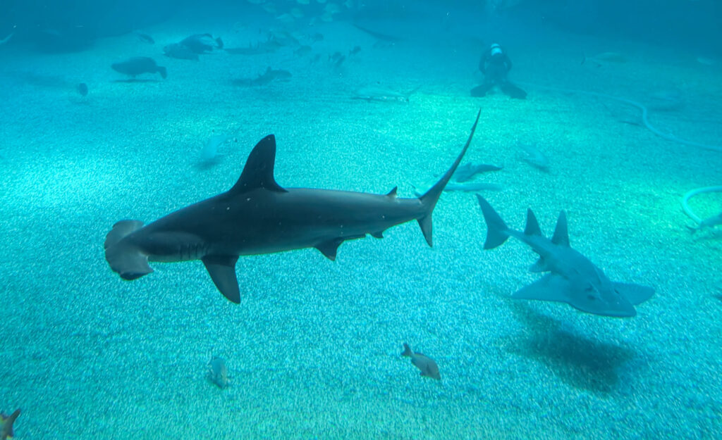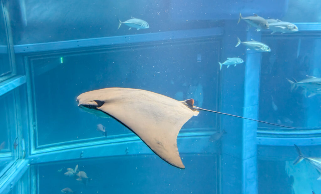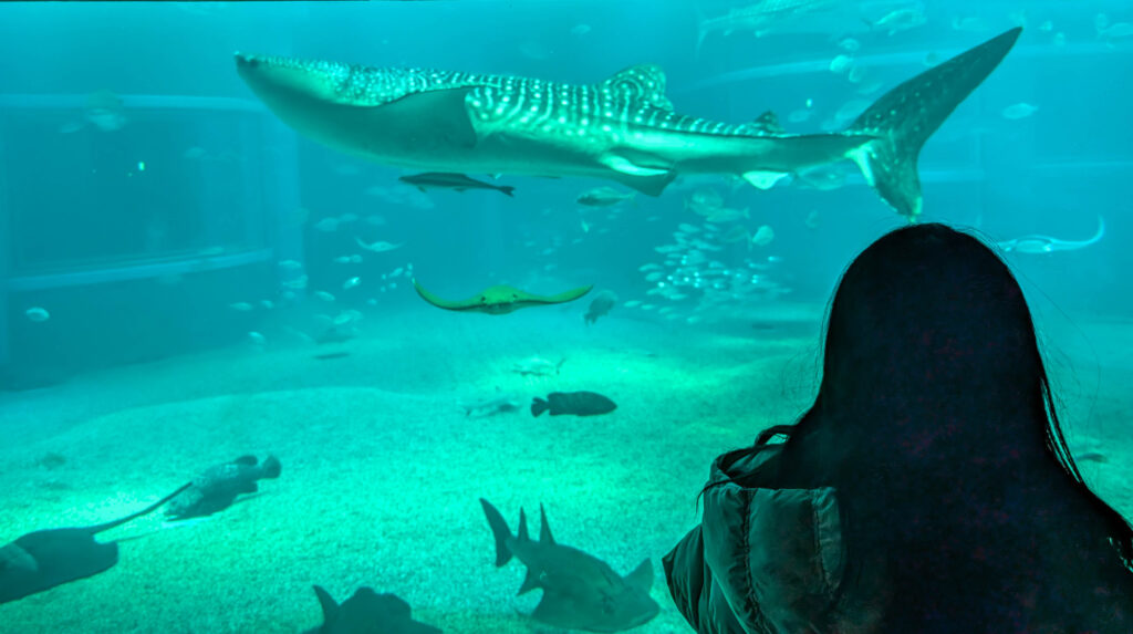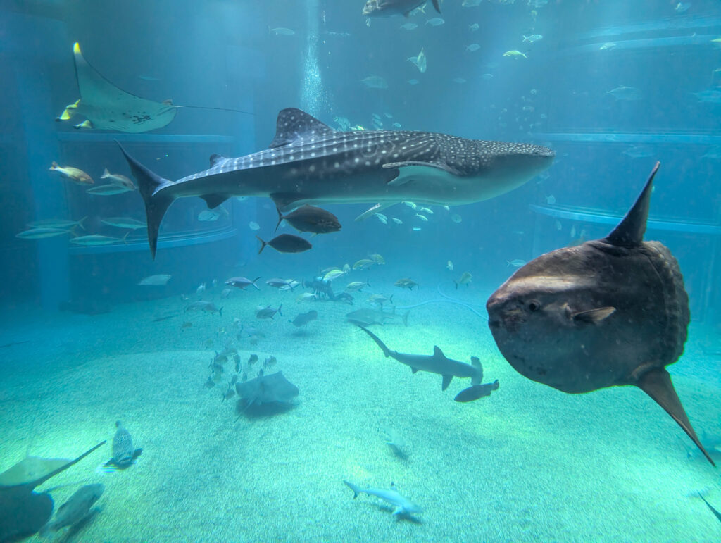 Berühmt ist das Kaiyuka für seine Walhaie. Die schwimmen zusammen mit vielen anderen Arten in einem riesigen Becken, das sich über mehrere Stockwerke von oben nach unten erstreckt.