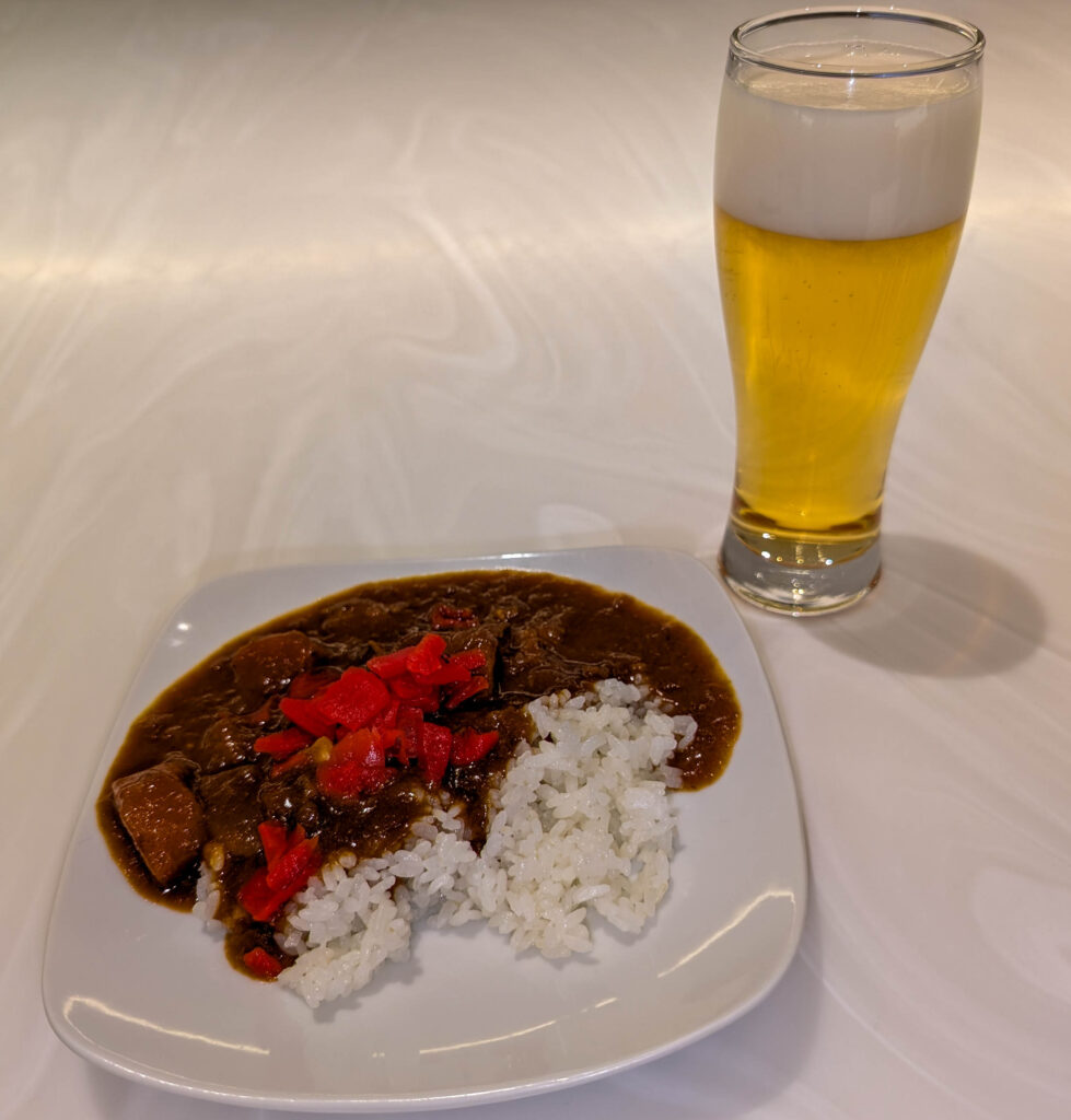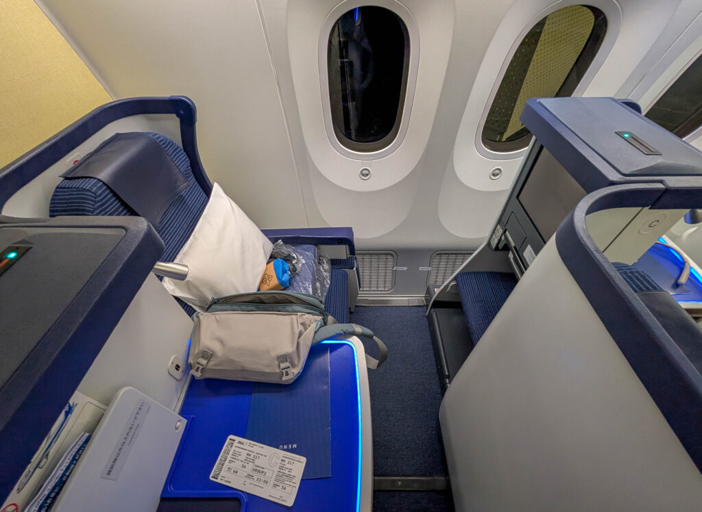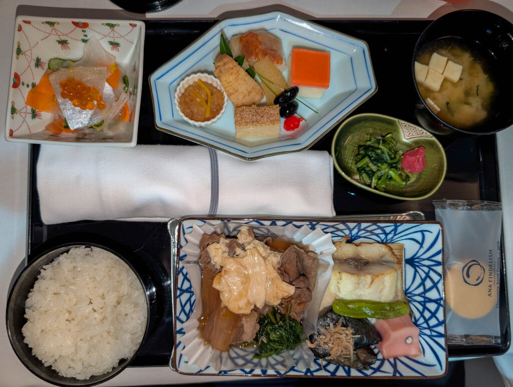 Diesmal bin ich mit All Nippon Airway zurückgeflogen und nicht wie sonst mit Lufthansa. Das erwies sich als sehr gute Idee. Die Qualität von Essen und Service waren vergleichbar, aber selbst die „alte“ Business Class von ANA (es gibt auch eine neue, die hatte ich aber nicht) ist um Längen besser als die alte Business Class von Lufthansa. So ist das Flugzeug nicht 2-2-2 bestuhlt wie bei LH sondern 1-2-1. D.h. jeder Sitz hat direkten Zugang zum Gang und sie sind versetzt angeordnet, mit einer substantiellen Abstellfläche neben dem Sitz. Wenn man (wie ich) einen Fensterplatz hat, bedeutet das ziemlich maximale Privatsphäre, da man gut 50cm vom Gang entfernt sitzt und dazwischen einiges als Barriere hat. Die neue Business Class von ANA ergänzt da noch eine Tür und nennt sich „The Room“ aber auch die alte ist prima.