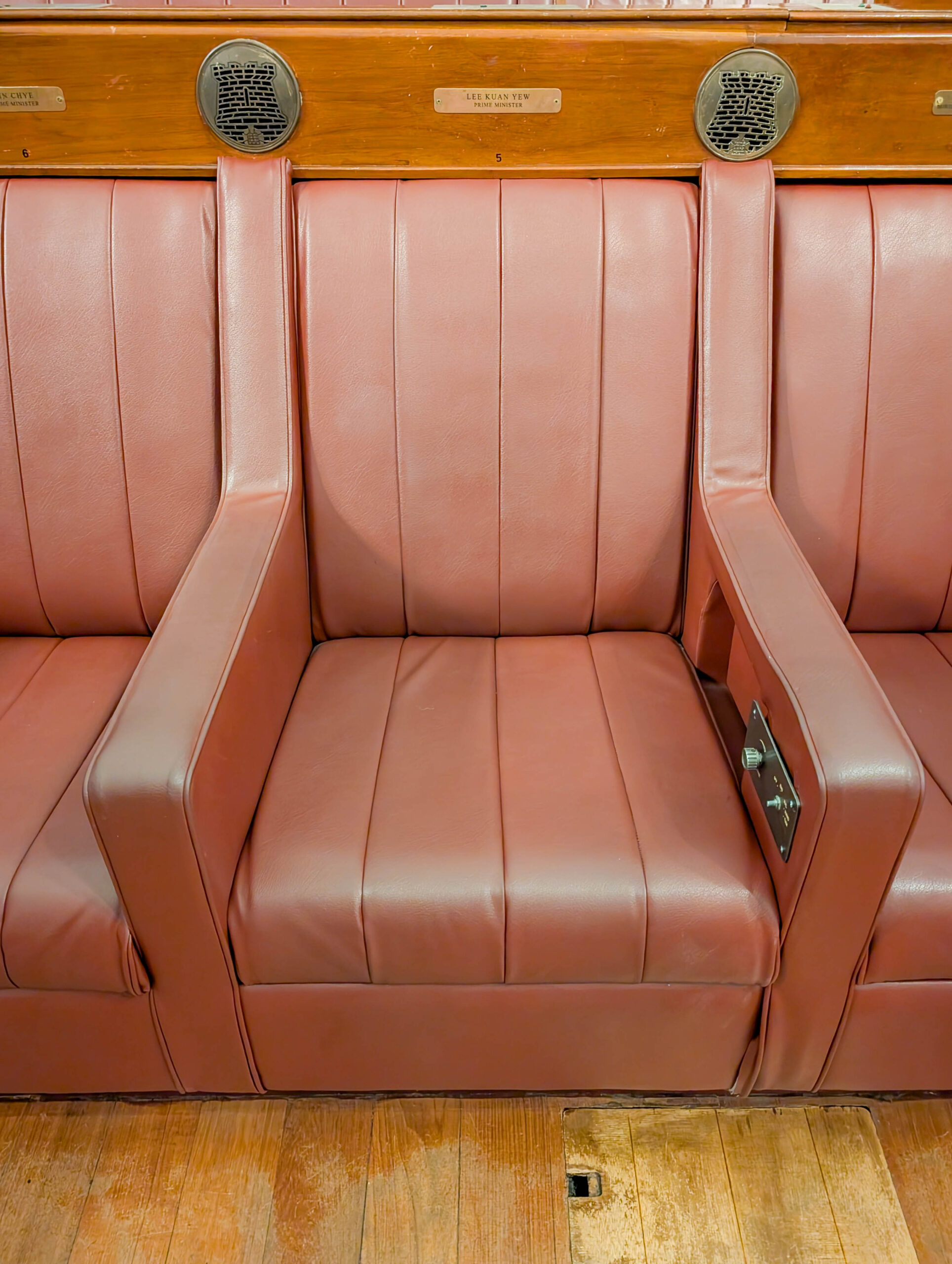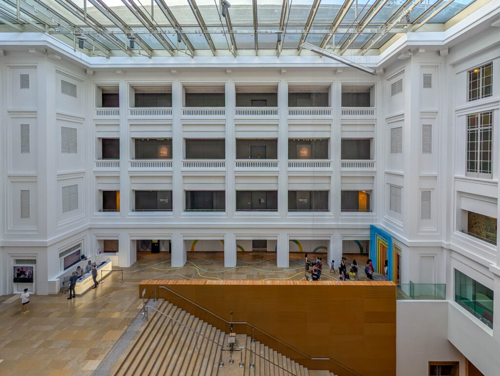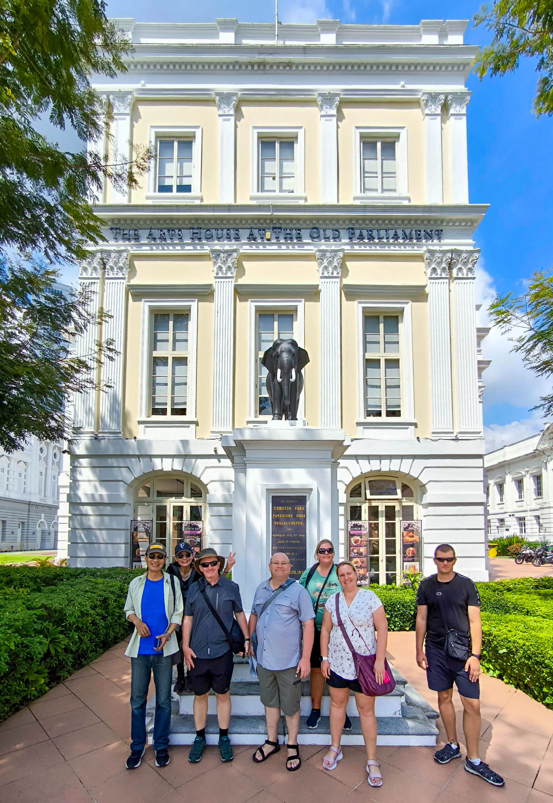Zunächst ging es in die Nationalgalerie. Diese besteht aus zwei Gebäudeteilen, hier sieht man das alte Rathaus von Singapur, wo ein Großteil der Verwaltung stattfand.Hier sieht man auf den anderen Gebäudeflügel, das alte Gerichtsgebäude. Den Zwischenraum hat man Anfang der 2000er Jahre überdacht, als man aus Rathaus und Gerichtsgebäude die Nationalgalerie machte.Dieser Saal ist besonders geschichtsträchtig. Hier unterschrieben die Japaner 1945 die Kapitulation nach gut drei Jahren Schreckensherrschaft und später wurde der erste Präsident Singapurs hier vereidigt.Nämlich dieser Herr, Encik Yusof Ishak. Er war allerdings, wie alle Präsidenten Singapurs, ein weitgehend zeremonielles Staatsoberhaupt. Es ziert heute alle Geldscheine.Heute treiben sich da ungeniert Touristen rum.Das Dach des Gebäudes ist schön begrünt und von Wasser bedeckt. Ganz links oben sieht man das „Ufo“, die Aussichtsplattform des neuen Gerichtsgebäudes direkt daneben.Man hat Aussicht auf die Victoria Concert Hall, die tatsächlich schon immer ein Kultur-, kein Regierungsgebäude war. Dahinter der Finanz- und Handelsdistrikt mit der Skyline.Hier der Verbindungsteil zwischen dem alten Rathaus und dem alten Gerichtsgebäude, die heute zusammen die Nationalgalerie bilden. War früher ein Parkplatz. Die Säule in der Mitte soll einen Baum darstellen. Das Modell zeigt die Verbindung der beiden Gebäudeteile. Die goldene „Rutschbahn“ in der Mitte ist eben das Dach des Verbindungsteils. Kostenpunkt der ganze Renovierung: über S$500 Millionen, weil das Fundament aufwändig saniert werden musste. Immer noch billiger als das Humboldt-Forum in Berlin…Im alten Gerichtsgebäude landeten wir kurzfristig im Knast.Nächster Programmpunkt war das alte Parlamentsgebäude, welches auch heute als Kunstareal genutzt wird. War ursprünglich die Villa eines Händlers, wurde dann aber von der Regierung gemietet.Hier von vorne, mit einem vom König von Siam bei seiner ersten Auslandsreise gestifteten Elefanten.Der Plenarsaal des alten Parlaments. Westminster en miniature.Der Parlamentssessel von Lee Kuan Yew, dem langjährigen Machthaber und Premierminister von Singapur, 1959-1990.Das Victoria Theatre von außen, mit der Statue von Sir Stamford Raffles, dem Stadtgründer von 1819 im Vordergrund.Selbst der ist vor den Touristen nicht sicher.Die Begrünung Singapurs ist immer wieder beeindruckend.