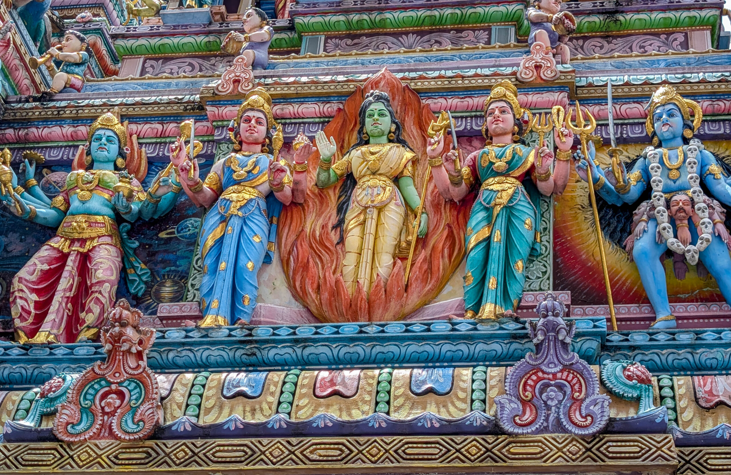 Aber die hinduistischen Tempel sind schon die spektakulärsten Gotteshäuser der Gegend. Hier Eindrücke vom Sri Veeramakaliamman Tempel: