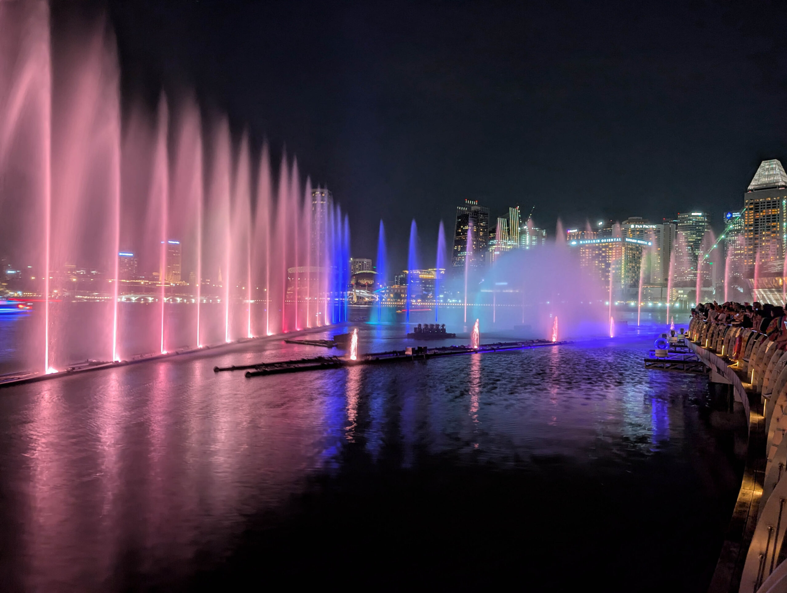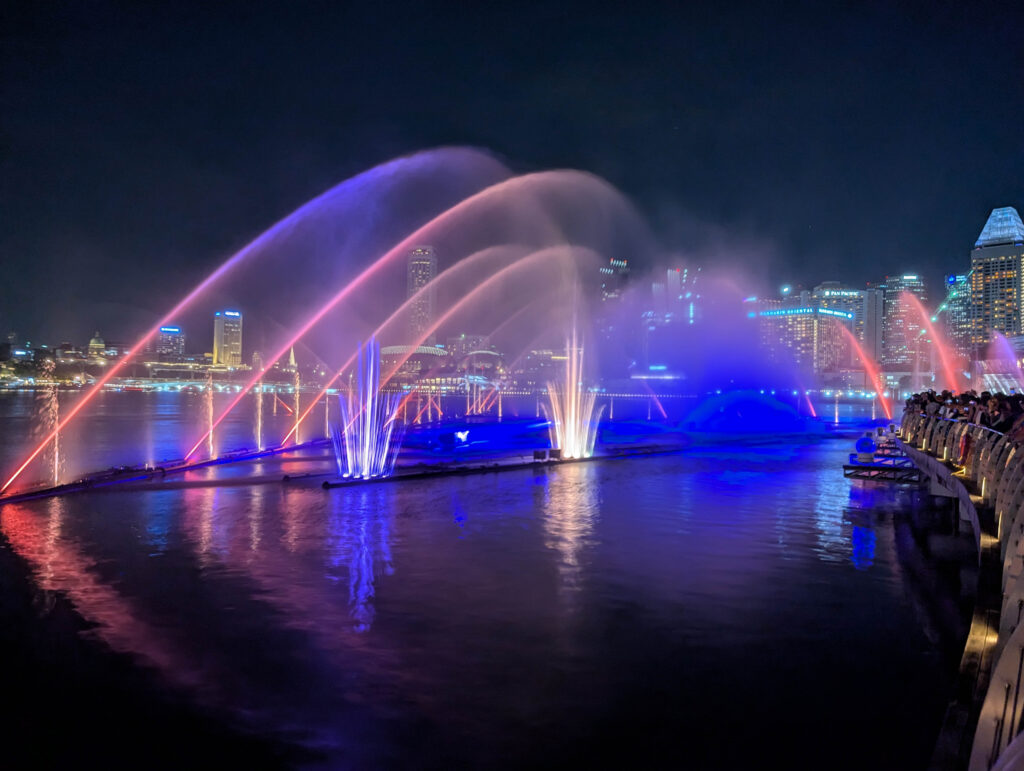 Wie man auf den Bildern sieht, ging während dieses Spaziergangs die Sonne unter. Das war auch eingeplant, denn wir wollten um 20 Uhr die Lightshow Spectra des Marina Bay Sands Hotel sehen. Das war auch tatsächlich ziemlich spektakulär.