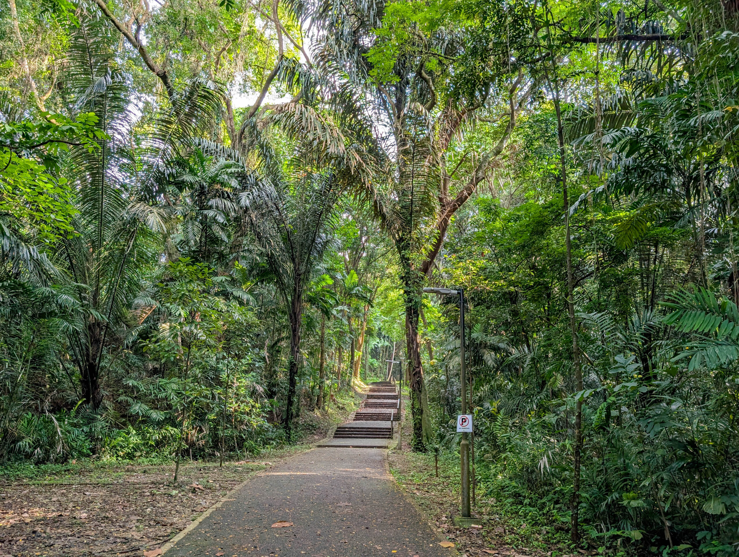 2019 bin ich sie von Westen nach Osten gewandert, diesmal von Osten nach Westen. Das ist alles kein schwieriges Gelände – es sind Parks, keine Naturschutzgebiete, aber dank der Hitze und Feuchtigkeit ist das schon ordentlich anstrengend, vor allem die knapp 100 Höhenmeter Aufstieg am Anfang auf den Mount Faber.